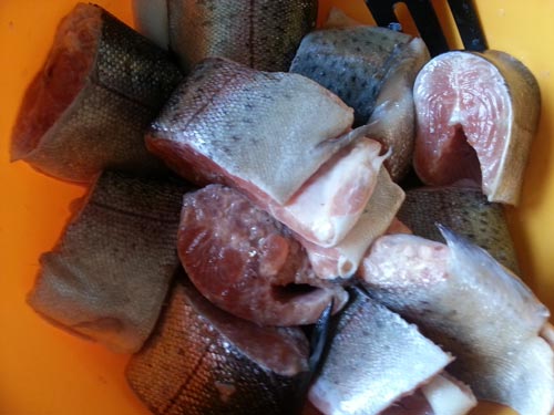Se curăţă şi se spală peştii, după care se îndepărtează capul şi coada (vor fi bune pentru un borş de peşte!). Tăiem păstrăvii în bucăţi late de 4 degete, le presărăm cu sare şi cu zeamă de lămâie. Vor fi ţinute astfel, acoperite, la frigider 1-2 ore înainte de preparare.