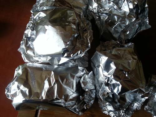 Se taie folia de aluminiu la mărimea potrivită pentru a cuprinde o bucată de peşte. Fiecare folie se unge cu ulei de măsline şi se aşază în interior bucata de peşte. Se adaugă ceapă tăiată fideluţă, capere şi boabe de piper verde după gust.