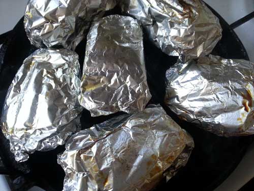Se impachetează bine fiecare bucată de păstrăv şi se aşază pe grătarul încins. Se lasă 8 minute pe o parte şi 8 minute pe partea cealaltă.